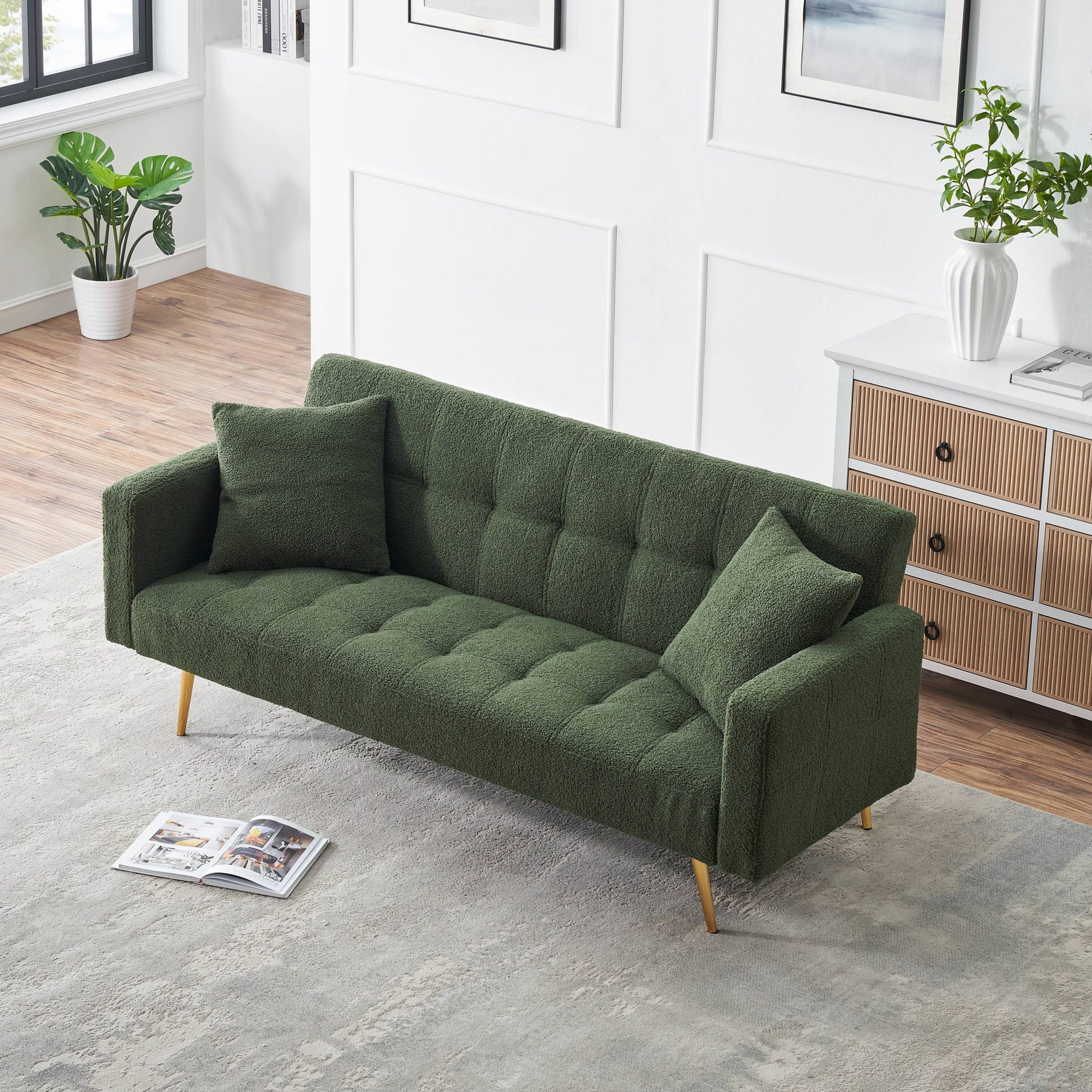 Elegant Green Teddy Fleece Sofa Bed with Two Charming Throw Pillows, Metal Legs, 71.7 Inches