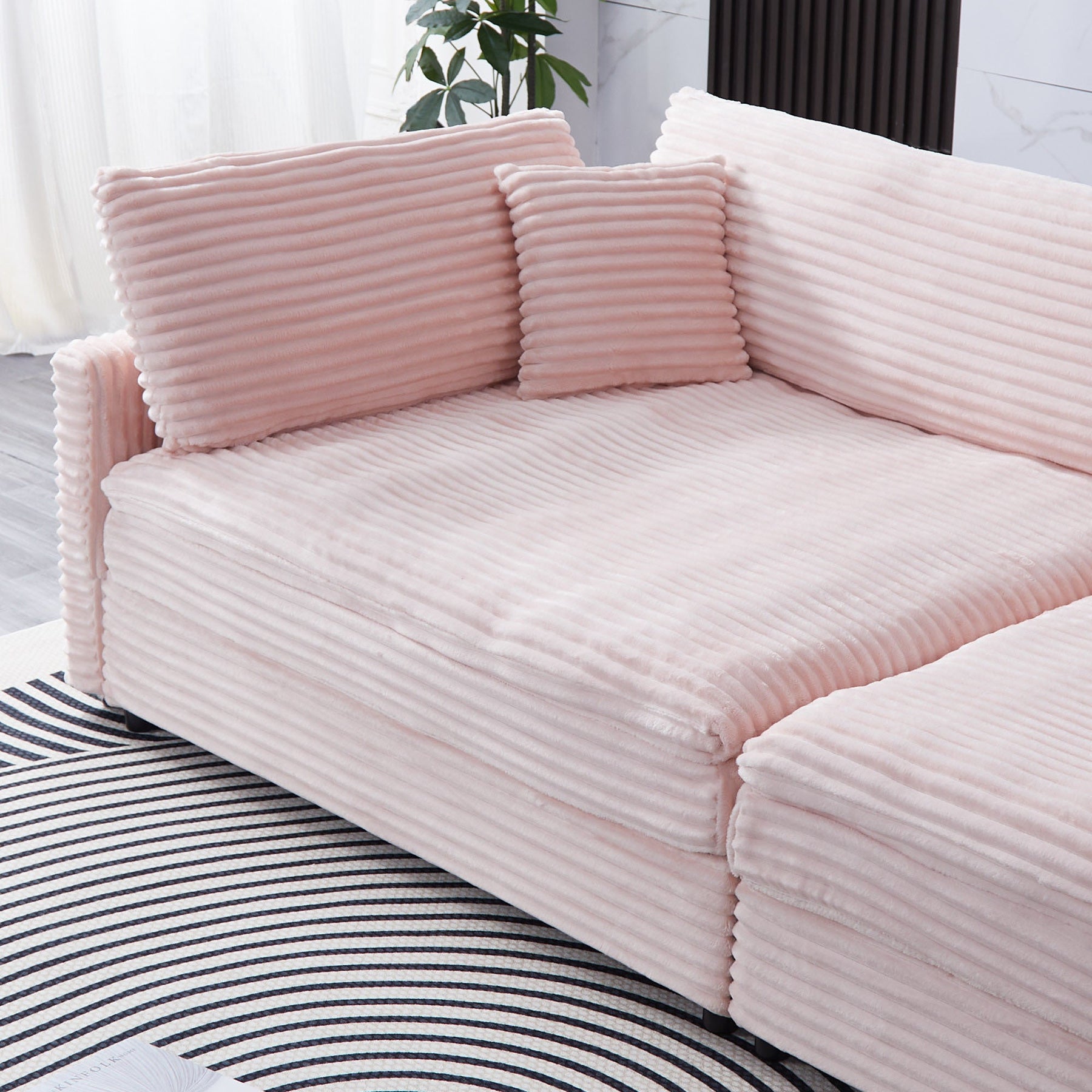 This pink sofa is like a romantic line of poetry in life. The soft tones, like cherry blossoms blooming in spring, are light and warm, instantly infusing the space with tender affection. The delicate striped texture is not only a visually exquisite embellishment but also brings a warm and soft touch to the touch. The lazy nest is nestled on it. Whether you are savoring coffee at the first light of dawn or immersing yourself in the world of books at dusk, it can carry every moment of your leisure with just the right comfort. Paired with a simple yet stylish black and white geometric carpet, it complements the artistic wall hangings, effortlessly outlining a fashionable and cozy corner of the home. Take it home and start a chapter of your elegant and leisurely life.